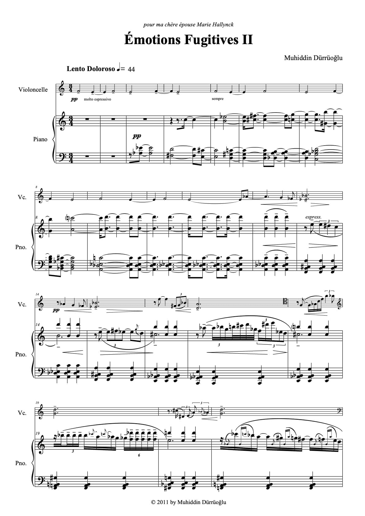 I composed these three pieces between 2004 and 2018 for my wife, Marie, who is a cellist. Each of the three, separa- ted by six or seven years, deals with the contrasts of emotions that can turn a life upside down and that run through it like leitmotifs: love, regrets, anxiety, lost time, the deep joy of the present ... Above all, I entered the sound matter and the effervescence of the timbres, in the full sensuality of the music. Their connections are highly organic. The first piece, which idealizes the purity of love, traverses madness, suffering and fear, before reaching hope with an offbeat choir that brings to mind the harmonies of the Renaissance. For the second, I was inspired by Wagner’s Tristan und Isolde: passionate love is conveyed in expressive romantic waves. The third is a liberation, a celebration marked by deep joy. It begins on an anxious note, omnipresent in the first, which at once dissolves in the dance. In it I can also hear the folk rhythm of my origins: it is my own dance, and the one I want to share.