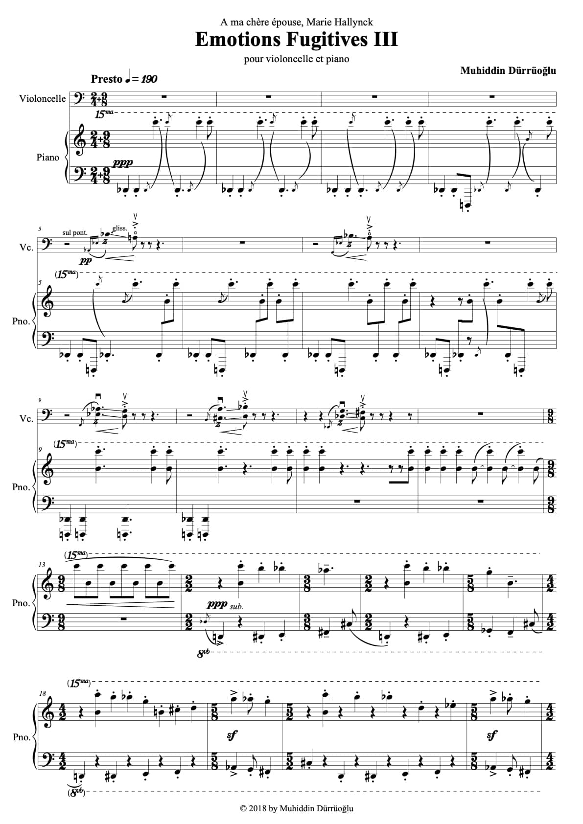 I composed these three pieces between 2004 and 2018 for my wife, Marie, who is a cellist. Each of the three, separa- ted by six or seven years, deals with the contrasts of emotions that can turn a life upside down and that run through it like leitmotifs: love, regrets, anxiety, lost time, the deep joy of the present ... Above all, I entered the sound matter and the effervescence of the timbres, in the full sensuality of the music. Their connections are highly organic. The first piece, which idealizes the purity of love, traverses madness, suffering and fear, before reaching hope with an offbeat choir that brings to mind the harmonies of the Renaissance. For the second, I was inspired by Wagner’s Tristan und Isolde: passionate love is conveyed in expressive romantic waves. The third is a liberation, a celebration marked by deep joy. It begins on an anxious note, omnipresent in the first, which at once dissolves in the dance. In it I can also hear the folk rhythm of my origins: it is my own dance, and the one I want to share.