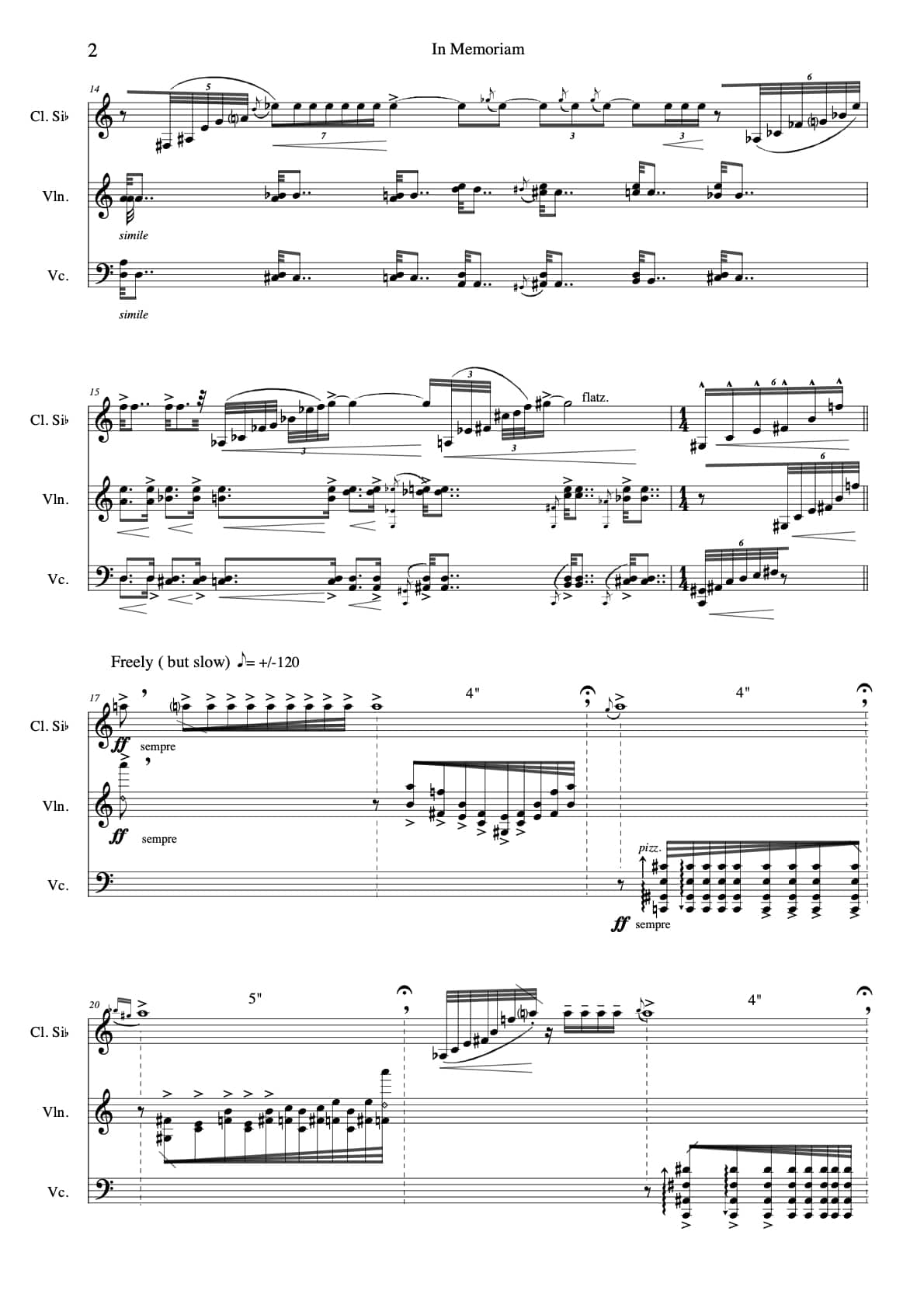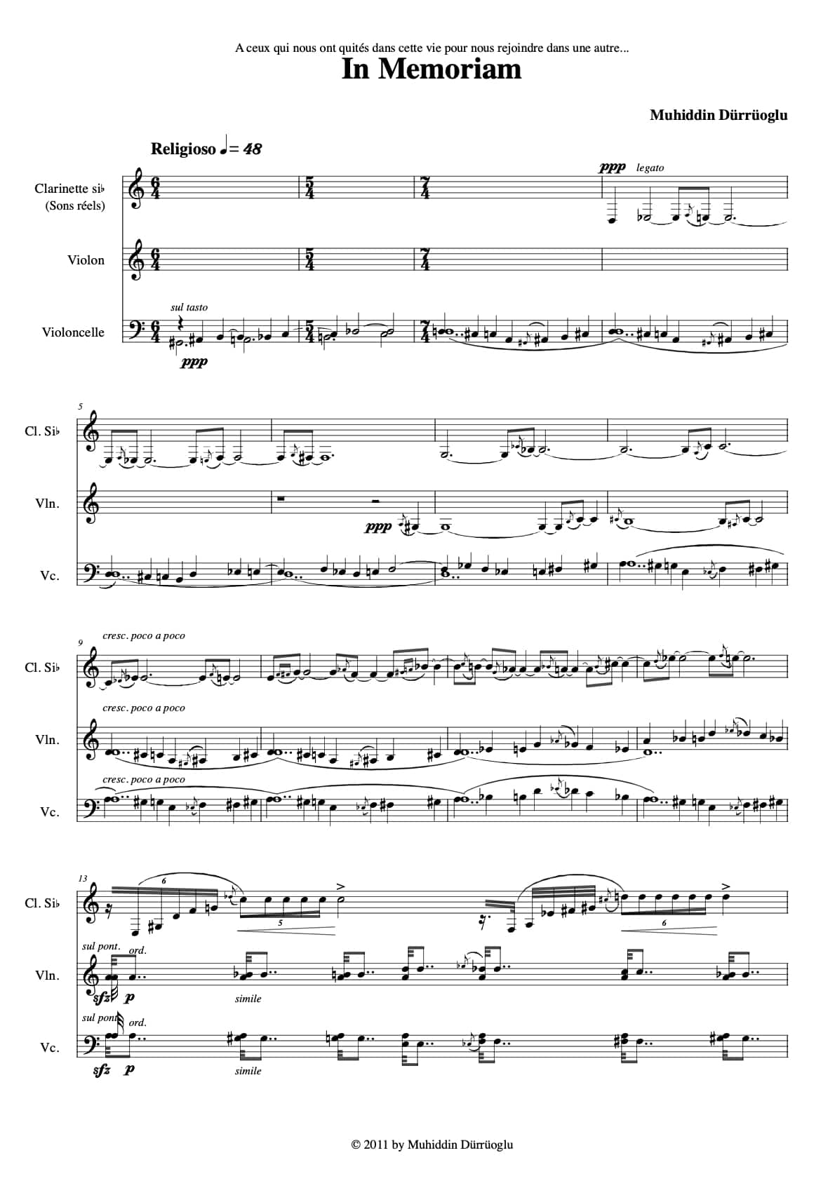 When my grandmother died, while I was in the United States, I composed Contact 2, subtitled Massspace. I had secretly dedicated it to her, inserting in it a sentence recited in canon: ‘In the memory of a lost one, whose spirit’s unknown particles will be alive forever in the darkness of the cosmos.’ When the Festival Juventus commissioned me to create a work in 2011, Marie’s father had just passed away; two months later, a very close friend died, the cellist Françoise Groben. I decided to rewrite Massspace around an Oriental lamentation in which the clarinet and cello cry and sing together, like the living around the deceased in rural Anatolia. A ritual rhythm inspired by the kudum of the whirling dervishes gradually blends with the dark and disturbing motif of the introduction until the violin, transported to a state of exhilaration, has exhausted itself and dies out. In silence, the performers then recite in canon the sentence I intended for my grandmother and all our dear departed. They take us to a heavenly choral derived from a Sufi melody, both mystical and soothing.