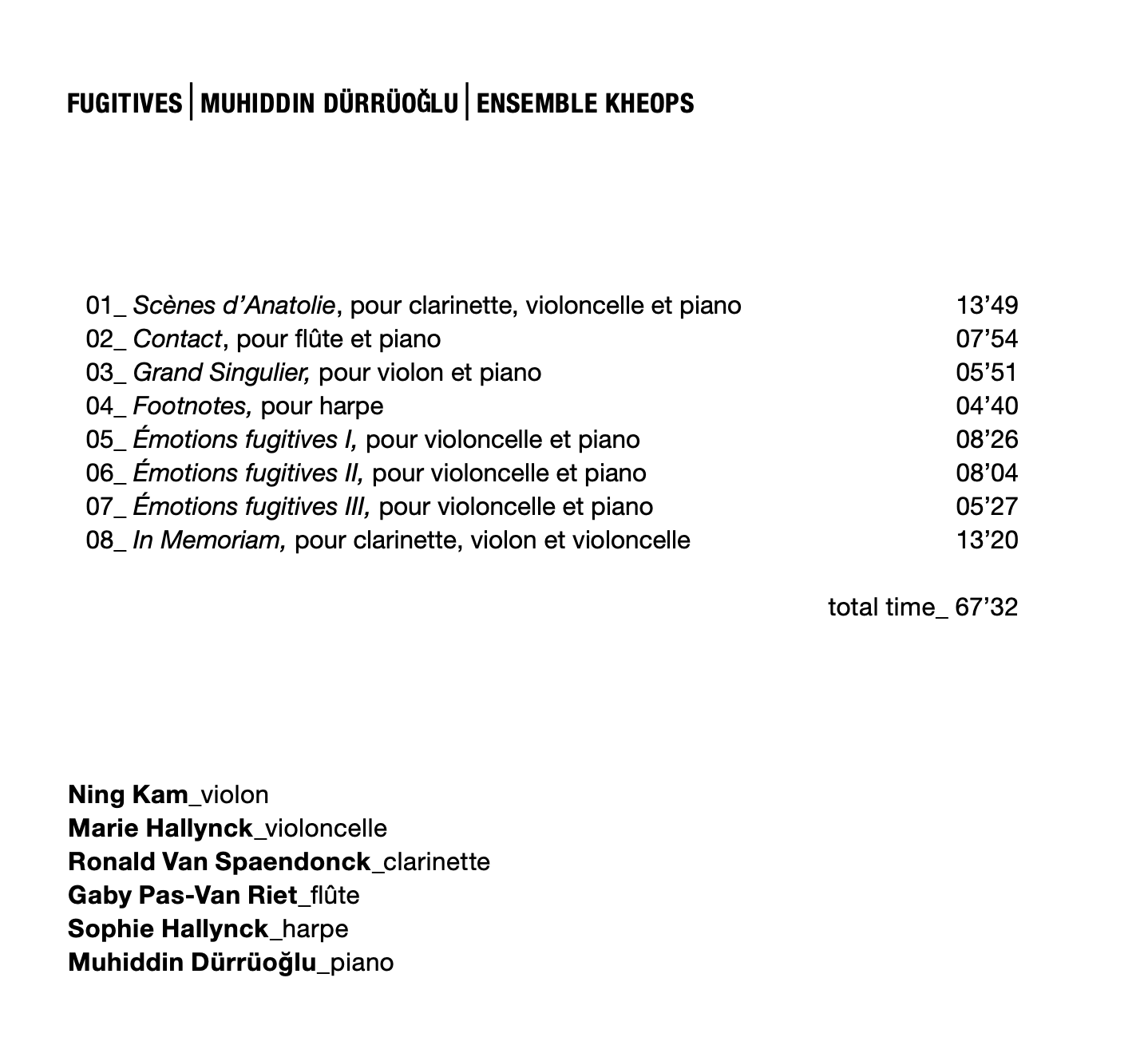 Fugitives est la première étape d’une aventure de l’ensemble Kheops chez Cypres : elle débute dans la contemporanéité de Muhiddin Dürrüoğlu et se poursuivra à rebours dans des trios de Brahms et dans le programme Danses rituelles, florilège de musique de chambre française avec harpe.